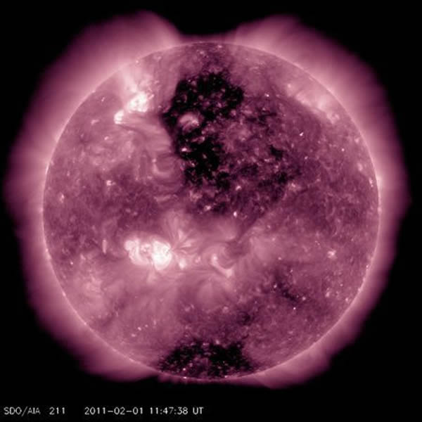 美国国家地理一周精彩太空照:新生恒星环 来源: 蜘蛛网 时间:2011年2月16日 16:16 3.太阳黑洞 太阳黑洞(图片来源:SDO/NASA) 2月初,太阳表面似乎出现一个秃斑,即一个指向地球的巨大日冕洞。在美国宇航局太阳动力学观测卫星进行的远紫外观测中,这个黑洞于2月1日在太阳顶端穿过。日冕洞是太阳表面一个带有磁性的空旷区域,向外放射出高速带电粒子。正如太阳动力学观测卫星所观测到的那样,日冕洞旋转并朝向地球,提高了观察到极光的可能性。 上一页12345下一页 上一篇 下一篇