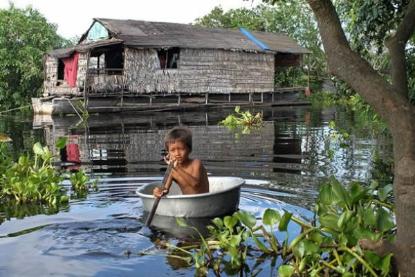 本图显示的是,2009年12月13日,一名男孩正坐在一个盆子里,漂浮于柬埔寨洞里萨湖地区一个水上小村庄中。根据“保护国际”组织2011年最新报告中的排名,印度-缅甸地区成为了世界上受到威胁最大的森林生物多样性热点地区之一。最新报告指出,该地区内的每一个港口都至少拥有1500种本土植物物种,但这些物种的原始生长环境已失去了90%以上。