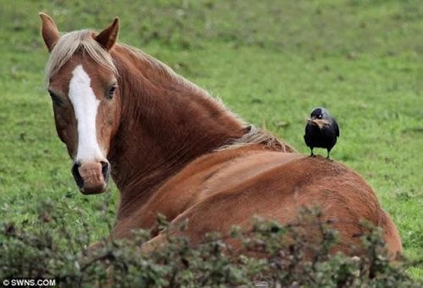 (蜘蛛网www.eeook.com)据《每日邮报》报道,如果你有一窝宝宝要抚养,改善家庭居住环境就迫在眉睫了。英国一只大胆乌鸦被抓拍到在马背上拔毛,修缮鸟巢,让自己的小宝宝生活的更加舒适。