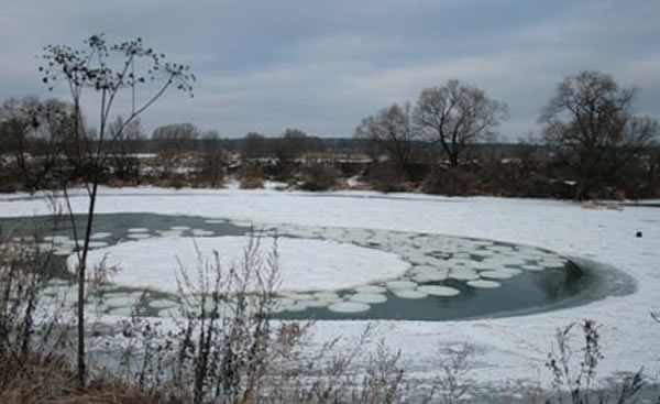 当水中的漩涡以一定直径尺寸大小做圆周旋转运动,使得水中的冰块和漂浮杂质在漩涡中均匀地分布,便形成我们现在看到的这种神秘的完美圆圈冰层。(蜘蛛网www.eeook.com)