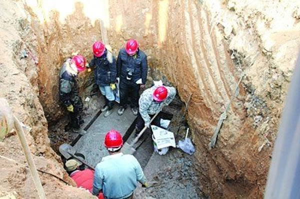 据了解,卢明恒家1962年从花果山大圣水库搬至新村,2008年才在鸡鸣山脚处盖的新房。因为地基打的浅,当时并没有发现地下有什么异样。“难道这是古墓?”卢先生立即停止了挖掘。卢先生首先向村委会干部报告自己挖井挖出墓穴这件事,村干部听后十分重视,并报警对现场进行了保护。