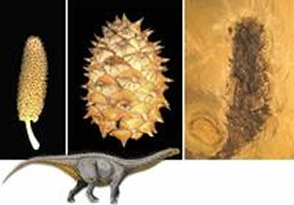 巨脚龙能够啃食古老的Walchiostrobus球花(右),它看起来像今天的雄球花(左),但它会发现,今天的雌球花(中)却无法一口吞下。