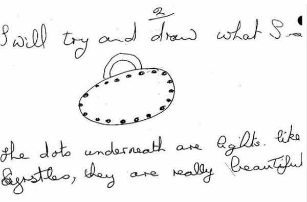 英国解密机密文件曝光大量UFO目击事件 来源: 蜘蛛网 时间:2011年3月05日 10:29 目击者画的UFO草图,曾在利物浦上空出现。 太空飞船草图。 UFO草图,曾在南威尔士上空出现。 上一页123 上一篇 下一篇