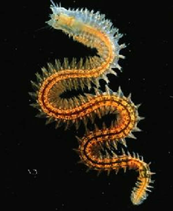 著名学者赫克尔所绘的水生环节动物。左上角是隐居动物的代表,利用头部的触须滤食;右上角是游走动物的代表,身侧的触须帮助快速游动
