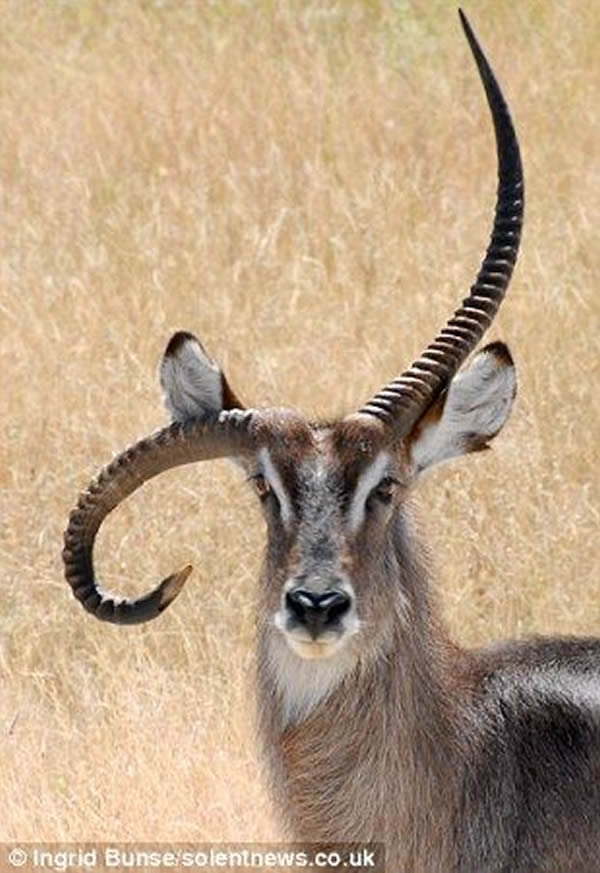 在纳米比亚的昂格瓦荒野保护区,49岁的业余摄影师英格里德•布恩瑟拍到一只怪异的水羚。它的一只角呈向下弯曲状并偏向一侧,非常惹人注目。布恩瑟是德国科隆人,曾在非洲游历多年。在此之前,她从未见到过如此怪异的水羚。