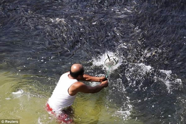 兴奋的当地渔民们冲向水中,抓住这难得的机会捕鱼