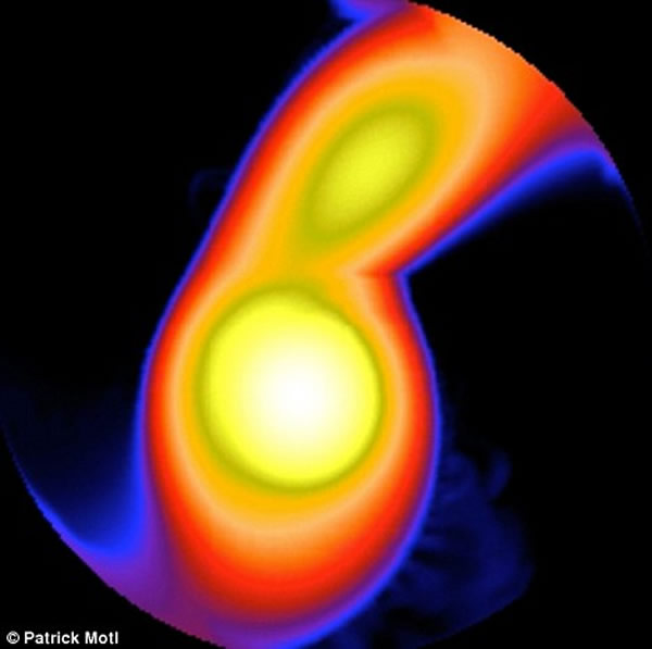 计算机模拟显示一对密接双星彼此近距离环绕最终合并,其亮度达到太阳亮度的3万倍以上