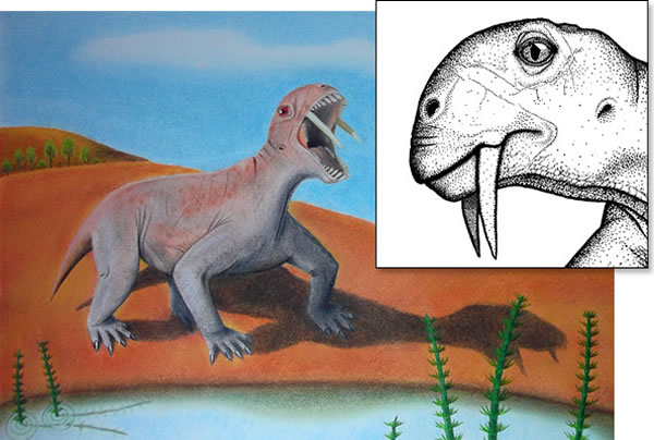 生有上犬齿的食肉动物非常罕见,而挥舞着这样一对獠牙的食草动物则是一个更加独特的“俱乐部”的一员。科学家如今描述了这样一种生物,生有短鼻子的貘般大小的动物,它们被称为 Tiarajudens eccentricus。这种被称作兽孔目动物是最终进化为哺乳动物的一种生物近亲,它们在距今约2.6亿年前生活在今天巴西的一个干旱地区。它们生有像磨牙一样的牙齿,适合于磨碎来自蕨类植物、树叶和茎秆的纤维性食物。但与其大多数食素的亲戚不同,Tiarajudens 还生有强健的军刀一样的牙齿,经测量至少有12公分长——该物种的名字的一部分被翻译为“不寻常的牙齿”。古生物学家在3月24日的美国《科学》杂志网络版上报告说,这些尖牙在边缘上并没有锯齿状凸起,因而可能并非用于咀嚼。相反,他们怀疑,这些与众不同的牙齿可能用来威慑食肉动物、与竞争对手搏斗,或是种群个体轻松识别其同类的一种方式。