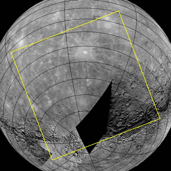 信使号探测器入轨后将拍摄的第一张照片覆盖图中黄色框框中的区域,这片区域中包含有此前从未被考察过的地区(图中黑色部分)