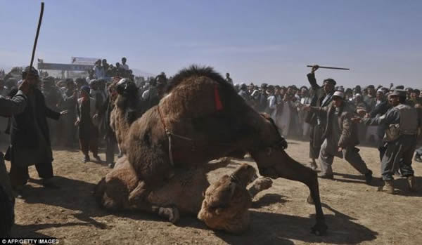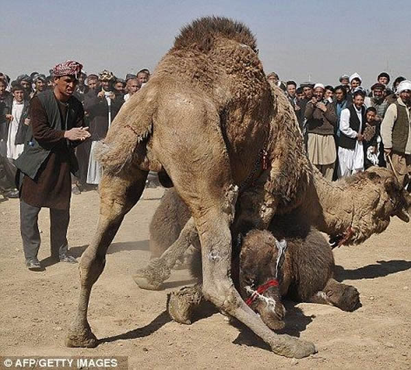 能够让这些沙漠之舟变得如何凶猛的原因只有一个,那就是它们进入了交配季节。在将两头雄驼领进斗场之后,阿富汗人会用一头年轻的雌驼挑逗它们,让它们兴奋起来。在此之后,一场激烈的较量随之上演,乳白色的唾液和鼻液开始从它们口中和鼻中流出。比赛中,它们要想尽办法将对手掀翻在地。为了取胜,它们不能光靠蛮力,需要一定的技巧,比如说采取佯攻。
