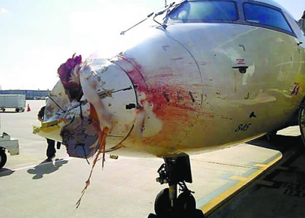 4月2日,美国达美航空公司一架航班号为5087的客机在飞往阿肯色州小石城国家机场途中与一群飞鹤相撞。美国联邦航空管理局(FAA)发言人琳恩伦斯福德表示,飞行员在当地时间2日16时38分紧急呼救塔台,30分钟后飞机安全降落后,发现机头被撞破一个大洞,血肉模糊的死鹤尸体还残留机头,旁边还有许多凹坑。
