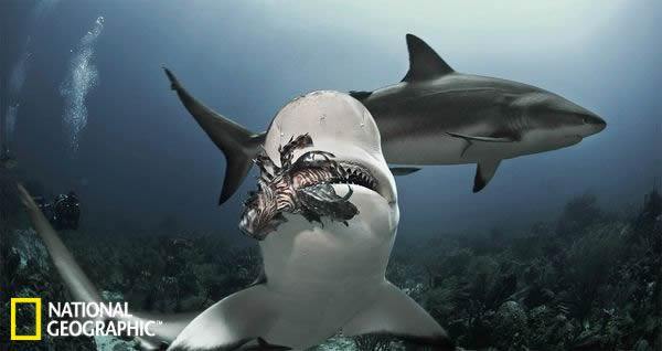 图为洪都拉斯沿海清澈的罗丹国家公园水域,一头加勒比海礁鲨正在大肆咀嚼一只入侵的狮子鱼。当地潜水员与公园工作人员合作,试图训练鲨鱼捕杀这一外来珊瑚礁物种——原产自太平洋和印度洋——让它们对品尝这种“进口食品”产生兴趣。由于没有天敌存在,加勒比海和美国东南海域的狮子鱼数量呈爆炸性增长趋势。10年前,水族爱好者无意间将这种动物引入这些海域。