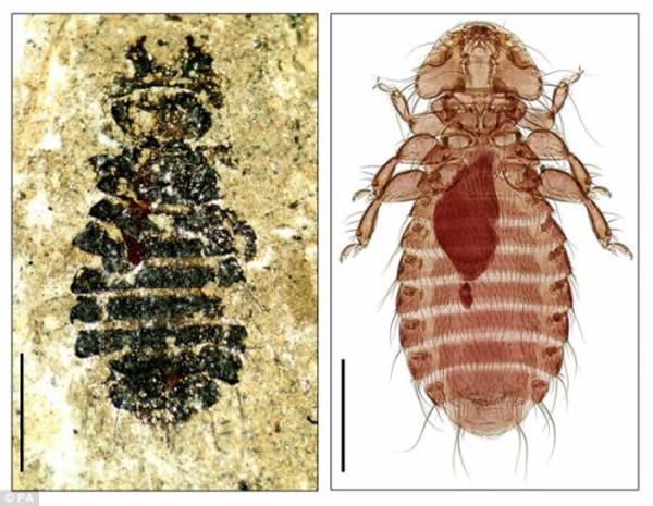 左图为一块虱子化石,距今4400万年,右图为一只寄生在水禽身上的现代虱子。科学家认为虱子可能吸食长羽毛恐龙的血。
