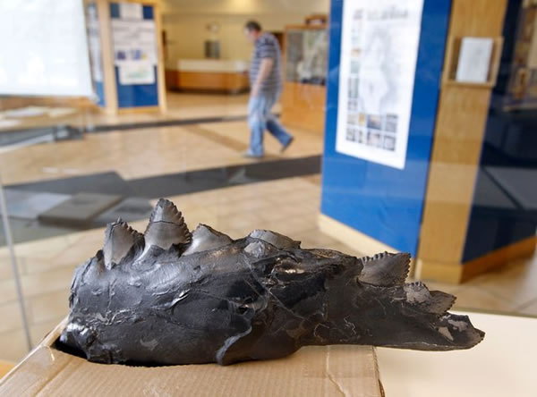 据美国媒体4月10日报道,今年2月间美国一名矿工在肯塔基州某矿井内发现了一块黑色的颚骨化石,研究人员鉴定后认定这是被古生物学家称作剪刀齿鲨的颚骨化石,距今约3亿年。该化石目前陈列在肯塔基大学博物馆内。