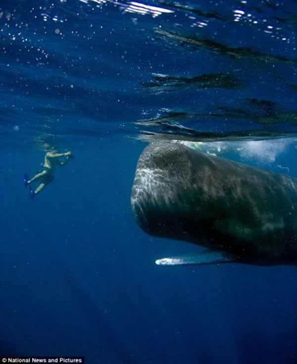 跟赫尔曼•梅尔维尔的著名《白鲸记》里凶残成性的白鲸主角不同,这些照片展现了这种世界上最大的哺乳动物温柔顺和的一面。多米尼加是加勒比海著名的赏鲸地,周围近海生活着大约200头抹香鲸,不过人类很难追踪到它们。船只通过声纳或者观察鲸鱼喷出的气泡寻找它们的踪迹,但是很难遇到抹香鲸玩性大发,想要与人类互动的时候。为了防止水肺产生的气泡搅扰到这种海洋动物,潜水人员仅借助通气管潜入水下。