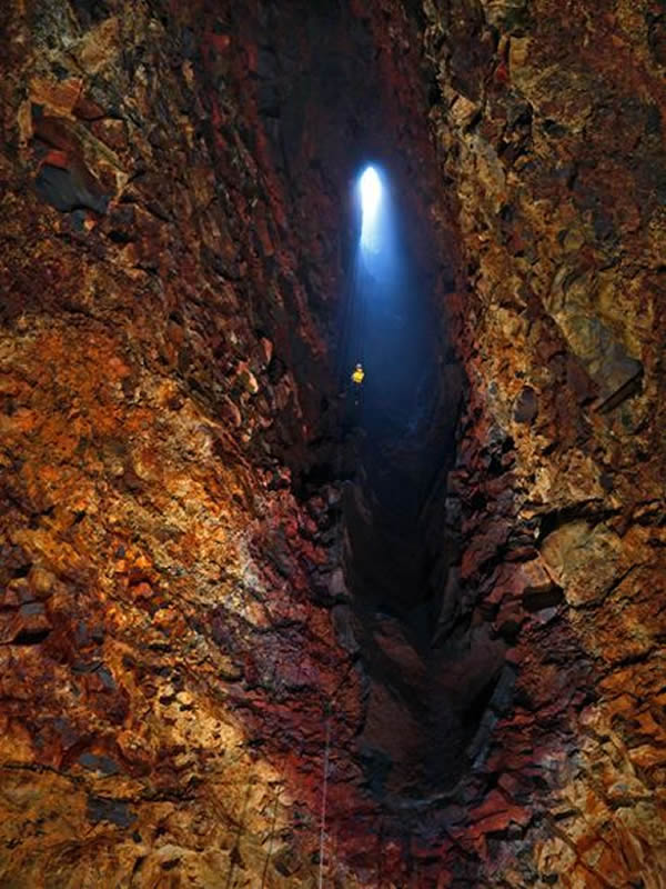 去年10月,登山者艾纳尔·斯特凡森随一个科研探险队首次进入冰岛火山Thrihnukagigur内部的岩浆房(magma chamber),从照片上可以看到,他正顺着一根绳索缓慢下降。岩浆房里的熔融岩浆在火山喷发时会渗出或冲出地面。这座休眠火山在大约3000年前最后一次喷发,它内部只有古代残留的岩浆,不过据专家说,Thrihnukagigur随时都有可能“苏醒”过来。