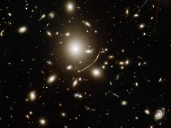 本图中部这个巨大的椭圆星系团中包含了大量的暗物质,因此它的引力能够使得光线弯曲,产生引力透镜效果。