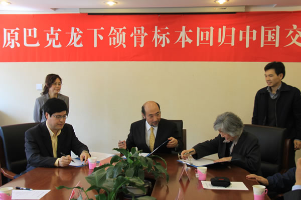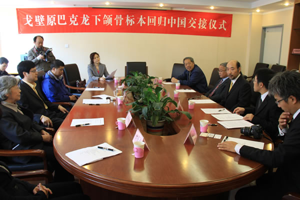2011年4月14日上午,“戈壁原巴克龙下颌骨标本回归中国交接仪式”在中国科学院古脊椎动物与人类研究所(以下简称“古脊椎所”)隆重举行。来自日本福井恐龙博物馆、中国古生物化石保护基金会、古脊椎所等领导嘉宾,与古脊椎所有关科研人员齐聚一堂,共同见证了在国外漂泊了近半个世纪的珍贵标本回归故里这一重要历史时刻。