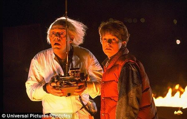 这是美国科幻电影《回到未来》的剧照,克里斯托弗·洛伊德饰演热衷发明的布朗博士,迈克尔·J·福克斯饰演布朗博士的朋友,一个热爱滑板和音乐的高中生马丁;这部影片对时空旅行进行了丰富的想象和描述