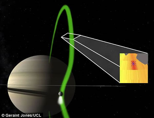 罗西尼号探测器拍摄到的连接土星和土卫二之间的电子光束,土卫二的南极地区喷发出喷气状气体和谷状冰粒