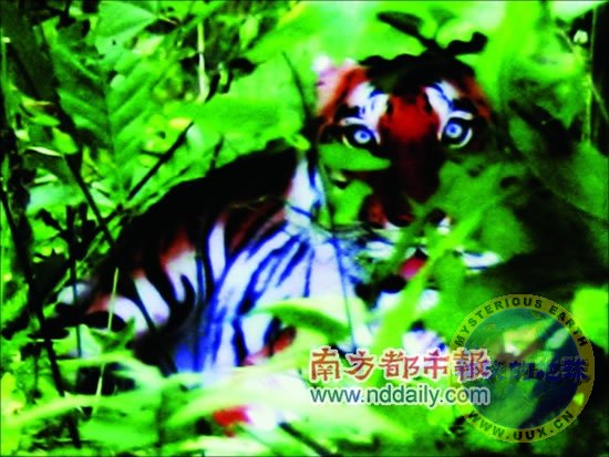 这是周正龙拍摄的第24张野生华南虎照片,虎目圆睁,露出凶光,依稀可以看到部分虎尾。这是整组照片中成像最好的一张。摄于2007年10月3日16时56分10秒(焦距:41mm、光圈:f5.0、速度:1/25)。《华商报》供图