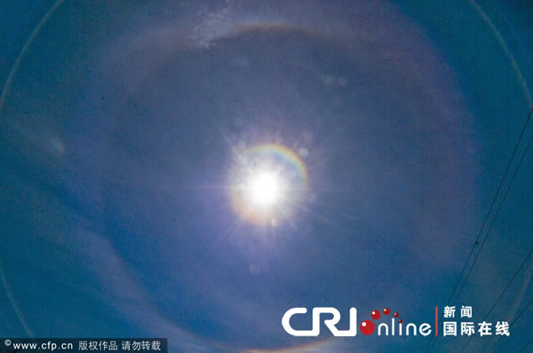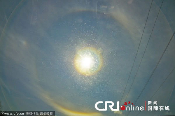 吉林省吉林市天空出现双圆形日晕 来源: 蜘蛛网 时间:2011年4月27日 15:44 吉林省吉林市天空出现双圆形日晕 吉林省吉林市天空出现双圆形日晕 2011年4月26日中午,吉林省吉林市松花湖上游天空出现了双圆形日晕,太阳像眼睛似的,吸引了人们的眼球。 CFP 上一篇 下一篇 TAG: 日晕