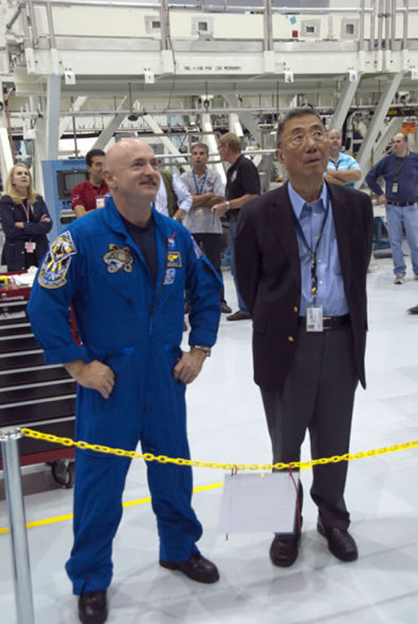 反物质太空磁谱仪项目首席科学家丁肇中(右)和“奋进”号航天飞机指令长马克-凯利(左)在佛罗里达肯尼迪太空中心检查反物质太空磁谱仪。