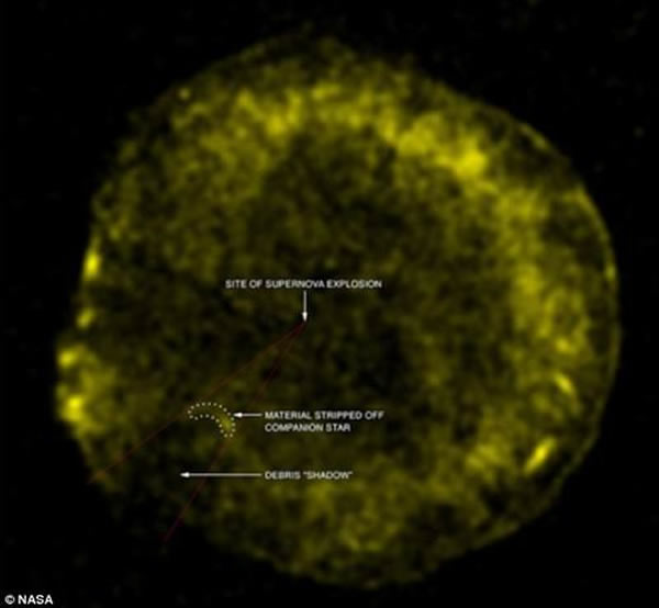 其它X射线弧光详细资料显示它来自于伴星,例如:超新星残骸喷射的X射线显示邻近弧光的“阴影”。这项最新研究发表在5月刊《天体物理学杂志》上。
