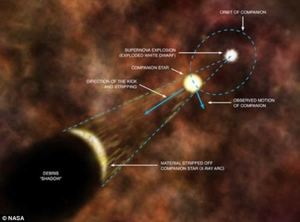 之前采用光学望远镜进行的观测研究显示,在超新星残骸中的恒星移动速度比其邻近星体更快,暗示着这颗恒星就是其伴星。基于X射线弧光的特性和“候选伴星”,研究小组认为,双星系统中两颗恒星在爆炸之前存在着轨道周期和分离距离。