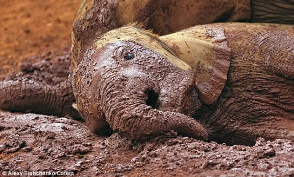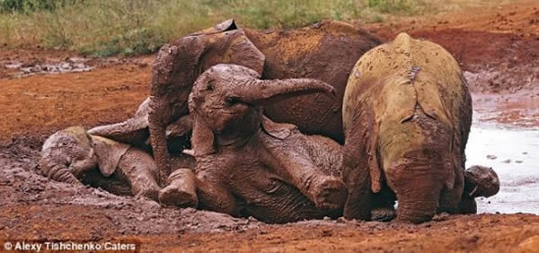 在这些大象孤儿看来,烂泥巴不仅可以消除酷热,而且还是它们的好玩具。它们在奔向泛着铁锈色的泥塘时,几乎无法掩饰住内心的兴奋,只见它们一头扎进烂泥里,开始疯玩起来。