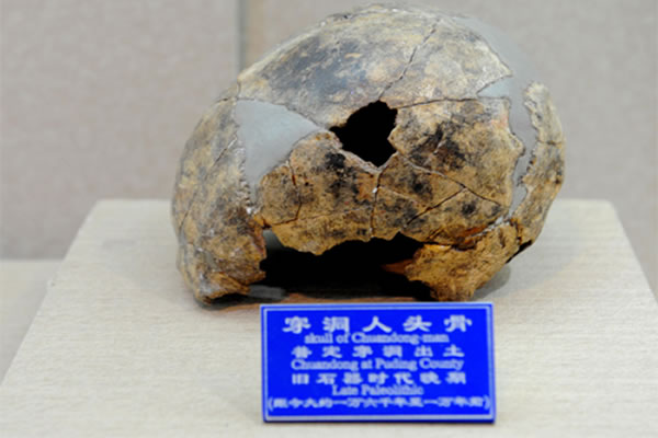 贵州省博物馆自然部主任研究员蔡回阳向记者介绍说,这枚头骨化石在1979年4月出土于普定县穿洞遗址内,是一枚约1万多年前的晚期智人头骨化石。