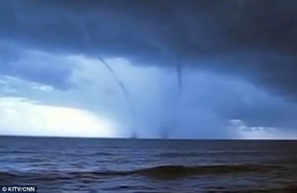 旋风在河流、湖泊或者海面上发生时,就会形成龙卷风。大气里的冷空气团经过水体时,温暖的潮湿气体向上升腾,形成巨大的水柱——一个由雾霭和冷凝液构成的“城堡”。这些宏伟壮观的水柱从海面上掠过时,它们会留下一条由水汽形成的尾迹。水柱的直径从几英尺到数百英尺不等,长超过1英里(1.61公里),深入到云团深处。海上龙卷风比旋风更微弱,往往只有它们从陆地上经过时,才会对人构成威胁。3日的“双龙吸水”奇观在下午大约5时50分出现,缓慢向西移动一会后就消失不见了。