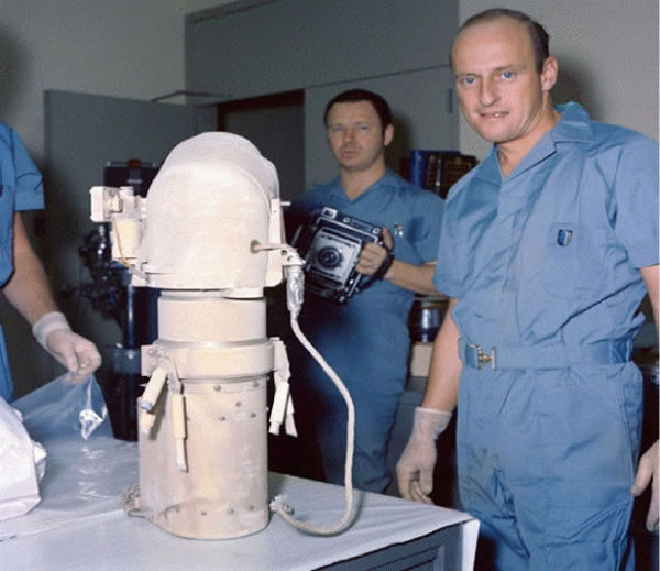 这是1969年11月阿波罗-12号任务后被送回地球的勘测者-3号着陆器相机设备。在宇航局的月球接收实验室,技术人员正在对其进行处置。随后这一相机设备将被打包供进一步分析,其中就包括细菌检测。