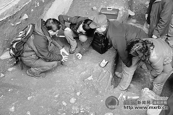 中科院古脊椎动物与古人类研究所专家对奇和洞考古发掘现场进行研究。