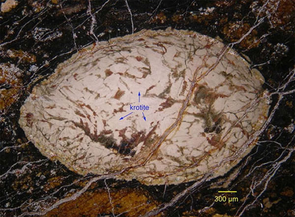 这种微小的矿物质仅有4毫米长,来自陨石中的颗粒,从外观上颇似“裂缝鸡蛋”。除krotite成份之外,“裂缝鸡蛋”陨石颗粒还至少包含其它8种矿物质,其中有一种是科学界未曾发现的新物质。