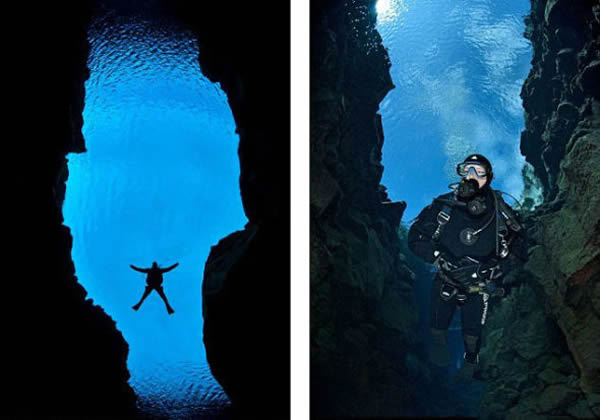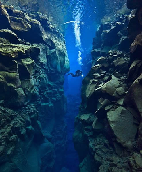 看起来这位潜水员是不是正在悠闲的漫游奇幻的水下世界,探索两旁的水下峡谷美景?但事实上,这位英国潜水员正漫游在两个大陆板块之间。