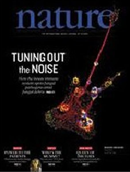 入侵的微生物可以被名叫“噬菌细胞”的白细胞检测到并吞噬掉。要做到这一点,这些细胞必须区分来自微生物的可溶成分(如细胞壁碎片)和颗粒状的微生物本身。对Dectin-1(一种先天免疫受体,能检测入侵的真菌病原体)的作用所作的一项研究表明,尽管该受体与可溶的及颗粒状的细胞壁b-glucans都能结合,但其激发因“噬菌细胞突触”的形成而仅限于与真菌细胞壁的接触点。“噬菌细胞突触” 为与微生物表面相连的配体而不是由微生物在一定距离释放的配体的检测提供了一个机制模型。本期封面所示为,鼠科动物的一个来自骨髓的“噬菌细胞”(红色/绿色)正在吞噬多个酵母颗粒(蓝色)。