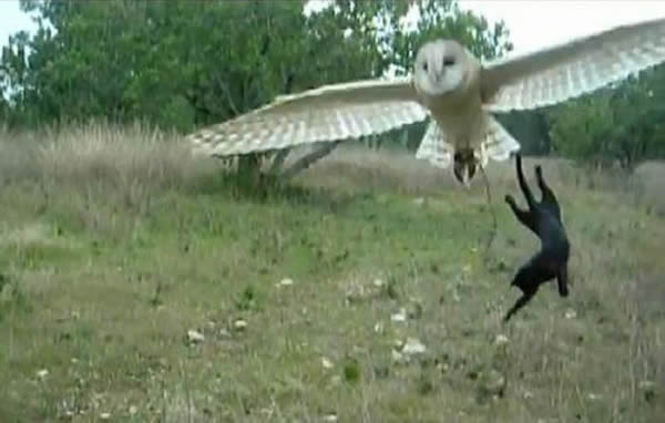 小猫跳起来,试图摸到低空盘旋的猫头鹰