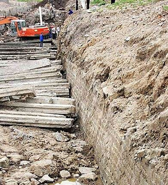 在发掘现场,考古人员对城砖进行测量,城砖长约60厘米,宽约为18厘米,厚度约为12厘米,在一些城砖上还发现反写阴刻的“邰窑”字样,初步断定为明代之物,距今有四百多年的历史。经文物部门实地勘查,这一砖工堤以木桩作基,垫以条石,然后在条石上将城砖以钉子形砌墙,并以糯米汁浇注,最后再以条石封顶,异常坚固。