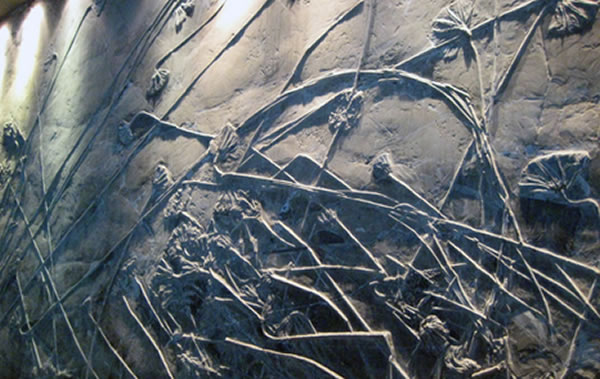 在长岭山崖的壁面,地质工作者还发现了被破坏的岩石层,岩石中有大量的生物化石,他们把这些化石收集起来,存放到陈列馆里。