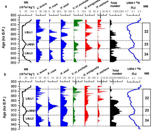 在黄土高原,L9黄土层又被称为上粉砂层,以其灰白的颜色、粗粒级的颗粒、松散的胶结及巨厚的沉积成为第四纪黄土-古土壤序列的标志性地层之一。以往的研究侧重野外直观的观察和物理、化学指标的分析,认为L9是极端冷干气候(强冰期)的产物。L9黄土形成于深海氧同位素MIS 24-22期(940-860 ka B.P.),但深海氧同位素记录表明,MIS 24-22是弱的冰期和间冰期,气候的寒冷程度远不如之后的冰期。长期以来,有关L9黄土沉积与同时期深海氧同位素记录的气候环境存在显著差异的问题,一直是学术界争论的难题,L9黄土曾被认为是区域性极端冷干气候的代表。