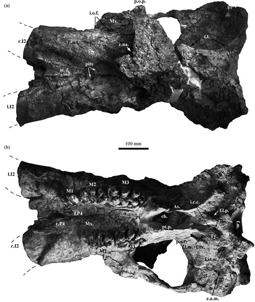 (a) 背面视; (b) 腹面视. 注释: As., 翼蝶骨; Bo., 基枕骨; Bs., 基蝶骨; ch., 内鼻孔; e.a.m., (次生的)外耳道; e.na., 外鼻孔; Ex.o., 外枕骨;f.l.m., 中裂孔; f.l.p., 后裂孔; f.m., 枕大孔; f.ov., 卵圆孔; f.st.m., 茎乳孔; Fr., 额骨; gl., 关节窝; i.c.c., 内颈动脉孔; i.o.f., 眶下孔; in.f., 门齿窝; J., 颧骨; l.I2, 左侧第二门齿; l.P4, 左侧第四前臼齿; M1, 第一臼齿; M2, 第二臼齿; M3, 第三臼齿; Mx., 上颌骨; Na., 鼻骨; o.c., 枕髁;p.a.c., 翼管后口; P.mx., 前颌骨; p.o.p., 眶后突; Pa, 顶骨; Pl., 腭骨; pt.p., 翼突; r.I2, 右侧第二门齿; r.P4, 右侧第四前臼齿; Sq., 鳞骨; t.l.,颞线; Ty., 听泡