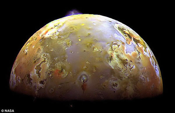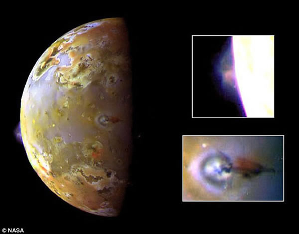 从拍摄到的木卫一图片中可以看到,这颗卫星上出现了两次含硫的火山喷发,且分别喷发出了距离卫星地表86英里高和46英里高的烟羽