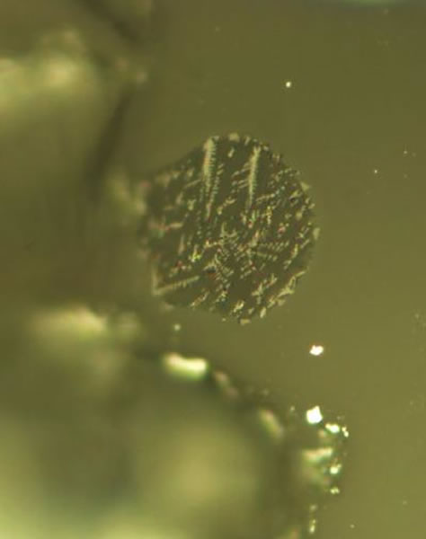 光学照片显示橄榄石晶体内部的阿波罗17号样品74220中的月球熔体包含物。包含物的直径为30微米。熔体包含物里的骨骼晶体为橄榄石和钛铁矿的混合物。