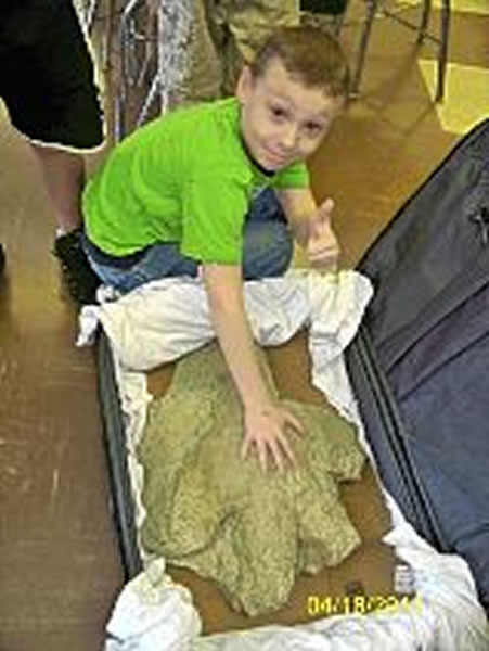 Shumaker女士将一块长2英尺(约60厘米),宽2英尺,重达80磅(约36.29公斤)的恐龙足迹化石带到了她儿子的学校并让他们身临其境的接触真正的恐龙足迹化石。