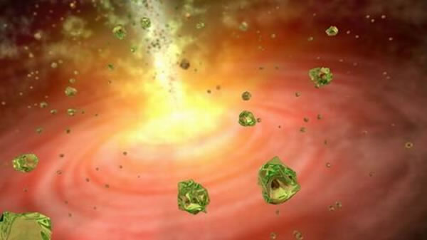 这项最新研究可能解释为什么类似的晶体发现于太阳系内一些彗星表面。“晶体雨”是由叫做橄榄石的橄榄绿色矿物质构成,它们存在于夏威夷绿色沙滩的橄榄绿矿石中。美国宇航局斯皮策太空望远镜红外线探测器发现晶体雨出现在一颗叫做HOPS-68的遥远类太阳胚胎恒星(原始恒星),它距离地球1350光年,位于猎户星座之中。这是首次观测到环绕成长恒星周围气体灰尘云中存在着晶体。