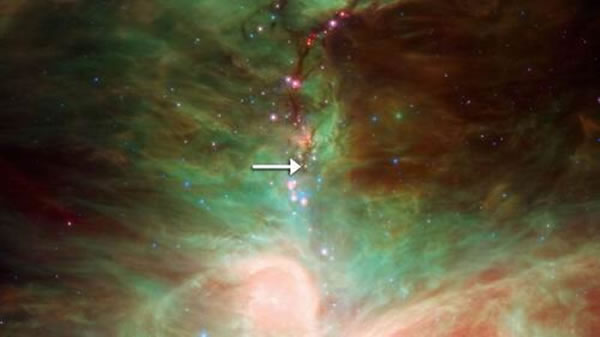美国宇航局斯皮策太空望远镜红外线探测器发现晶体雨出现在一颗叫做HOPS-68的遥远类太阳胚胎恒星(原始恒星),它距离地球1350光年,位于猎户星座之中。