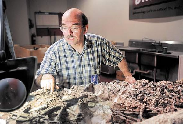 11年以来,K. Dermody一直在宾夕法尼亚州博物馆(State Museum of Pennsylvania)担任志愿者工作,他的工作就是让参观者亲眼看到和体验古生物工作者是如何现场挖掘和清理化石的。他在博物馆特地的展区中利用小刀,刷子等工具在巨大的泥岩上工作,Dermody的鼻子就像能闻到化石的气息一样,渐渐地,神秘的史前生物化石就呈现在了参观者面前。