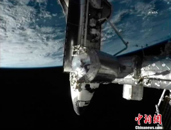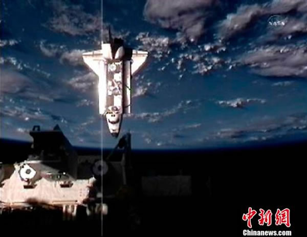 2011年5月18日,美国宇航局宣布,格林尼治标准时间18日10点14分北京时间晚上6点14分,“奋进号”航天飞机与国际空间站成功对接。图为“奋进号”航天飞机与国际空间站成功对接。