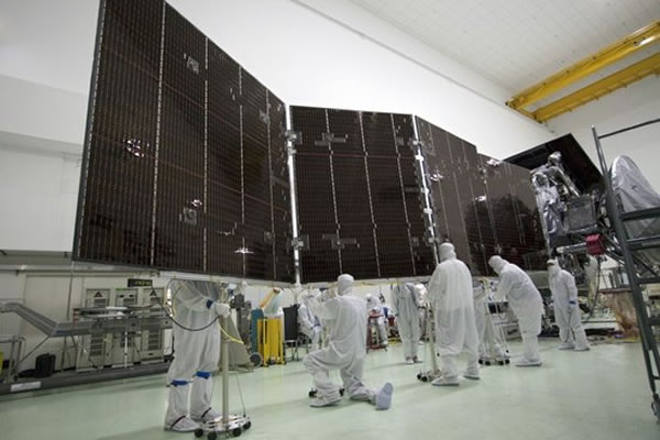 三个巨大的太阳能电池板将为美国宇航局朱诺(Juno)木星探测器电力,本次测试完毕后,巨大的太阳能电池板将折叠成发射状态,下次就是在前往木星的途中展开了。朱若号探测器是首个在距离据地球如此之远(木星与地球距离是地球到太阳距离的4倍:超过6.4亿公里)的宇宙空间中以太阳能作为主要能源的航天器。这就要求这种太阳能电池板具有高效的光能利用率,这也决定了其尺寸庞大:长度达到8.9米,宽度2.7米。足以为五只标准灯泡提供电力,如果太阳能电池板面对太阳的角度进行优化,最大可产生12-14千瓦的电力。